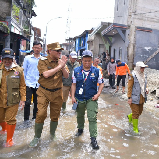 KABUPATEN BANDUNG - Wakil Gubernur Jawa Barat Erwan Setiawan meninjau sejumlah titik terdampak banjir di kawasan Dayeuhkolot, Kabupaten Bandung, Senin (8/12/2025).